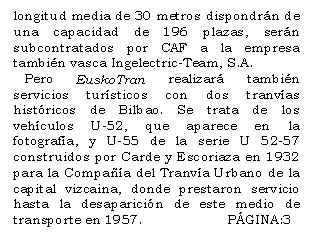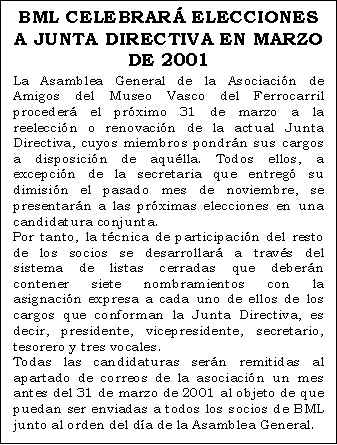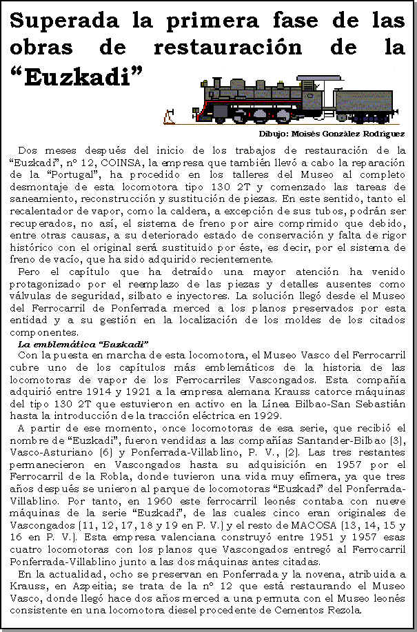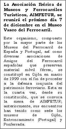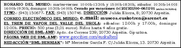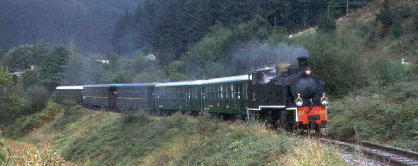 La campaña de 2000 del Tren de Vapor del Valle del Urola se clausurará el próximo día 8 de diciembre, hasta el primer fin de semana del mes de febrero de 2001, con el encendido de cuatro de las siete locomotoras de vapor que se encuentran en estado de marcha en el Museo. Como ya sucediese en la anterior jornada especial, los tres servicios previstos entre Azpeitia y Lasao con salida a las 11:00h., 12:00h. y 13:00h. se realizarán con la locomotora MALLET CP E 205, "Portugal" (1230 T), y los cinco coches de bogies de tercera clase fabricados por CAF para el Ferrocarril del Urola y Ferrocarriles Vascongados en 1925 y 1950. Esta composición, que se puede observar en la fotografía captada el pasado 14 de Octubre por el socio de BML Kepa Pérez Amuchastegui, compartirá la playa de vías del Museo con las máquinas "Espinal" (020 ST), "Zugastieta" (030 T) y la grúa de vapor de ancho ibérico de Babcock & Wilcox, construídas en Gran Bretaña en 1887, 1888 y 1920, respectivamente. Una quinta locomotora, pero de escala 1:15, la "González", fabricada artesanalmente entre 1925 y 1936, circulará por un trayecto de 40 metros encabezando un convoy compuesto por diverso material remolcado de viajeros y mercancías fechado en la misma época. Al término de la jornada, los miembros de BML se dirigirán al KIRURI para celebrar por segundo año consecutivo la comida de hermandad. (Se ruega a los socios confirmen su asistencia en el Tfno: 659583816. Precio por cubierto: 3.000 ptas).