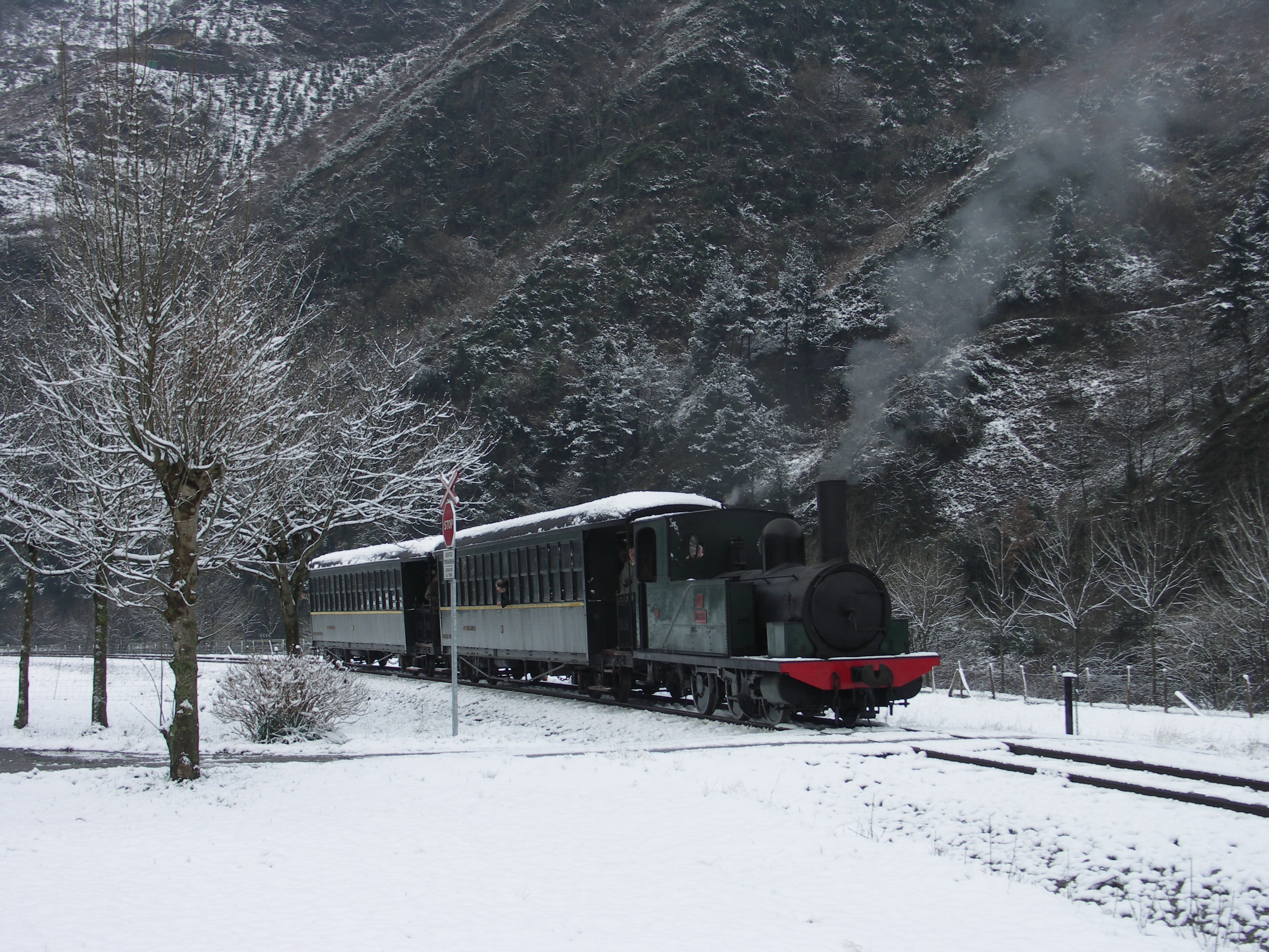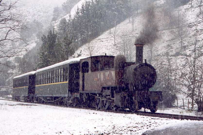 Foto del tren de vapor del Museo, con la locomotora "Zugastieta", en medio de una nevada. (Fotografía sacada por Juanjo Olaizola el 28/01/06).