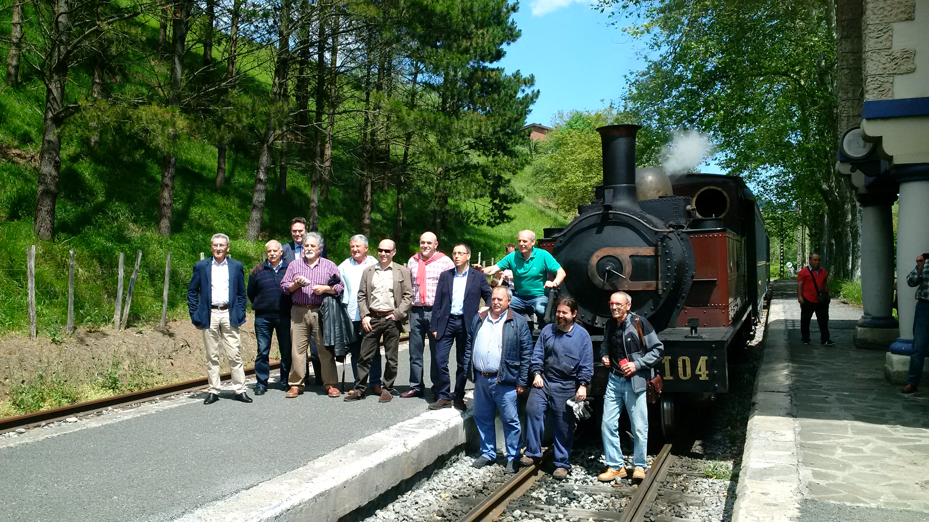 Hoy se ha celebrado en el Museo Vasco del Ferrocarril el homenaje a los trabajadores de EuskoTren que han cumplido 25 años en la empresa, así como a los que se han jubilado el pasado año. En la imagen, algunos de ellos posan ante la locomotora de vapor Aurrera en la estación de Lasao.